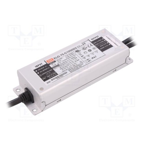 MEAN WELL ELG-75-C1050D2-3Y | Блок живлення: імпульсний; LED; 74,55Вт; 35÷71ВDC; 1,05А; IP67