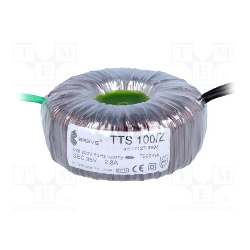 BREVE TUFVASSONS 17127-9998 | Трансформатор: тороїдальний; 100ВА; 230ВAC; 36В; 2,77А; Ø: 92мм