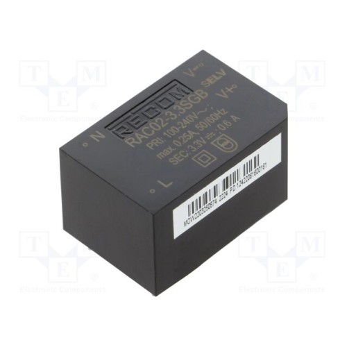 RECOM RAC02-3.3SGB | Перетворювач: AC/DC; 2Вт; Uвх: 85÷264ВAC; 3,3ВDC; Iвих: 500мА; 63%