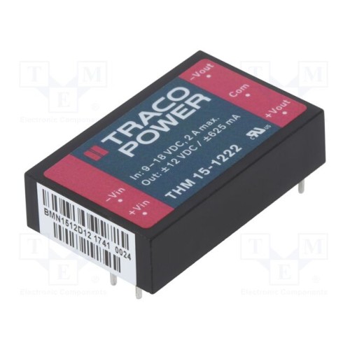 TRACO POWER THM 15-1222 | Перетворювач: DC/DC; 15Вт; Uвх: 9÷18ВDC; Uвих: 12ВDC; Uвих.2: -12ВDC