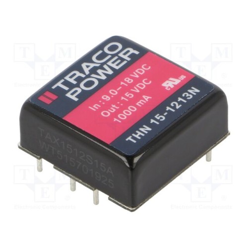 TRACO POWER THN 15-1213N | Перетворювач: DC/DC; 15Вт; Uвх: 9÷18ВDC; Uвих: 15ВDC; Iвих: 1А; 1\"x1\"