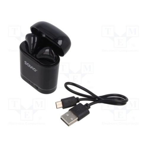 SAVIO TWS-02 | Бездротові навушники з мікрофоном; чорний; USB B micro; зі LED