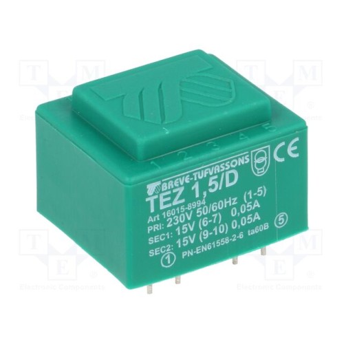 BREVE TUFVASSONS 16015-8994 | Трансформатор: литий; 1,5ВА; 230ВAC; 15В; 15В; 5мА; 50мА; PCB; IP00