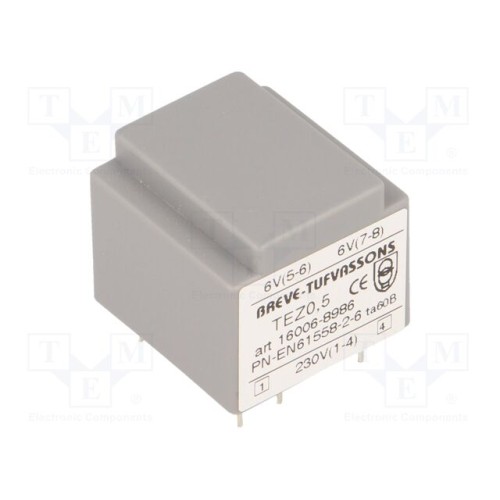 BREVE TUFVASSONS 16006-8986 | Трансформатор: литий; 0,5ВА; 230ВAC; 6В; 6В; 41,6мА; 41,6мА; PCB