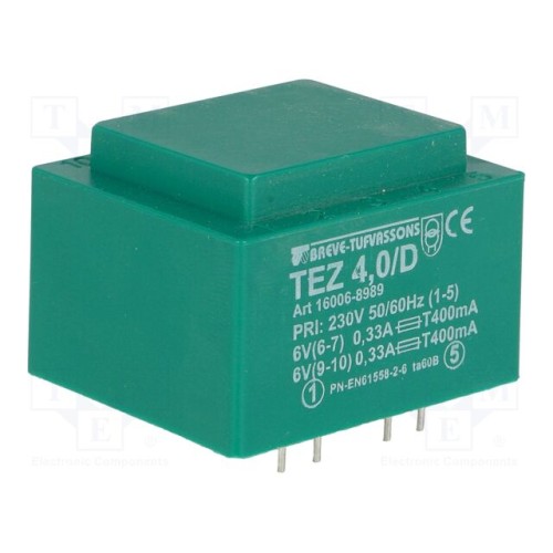 BREVE TUFVASSONS 16006-8989 | Трансформатор: литий; 4ВА; 230ВAC; 6В; 6В; 333,3мА; 333,3мА; PCB