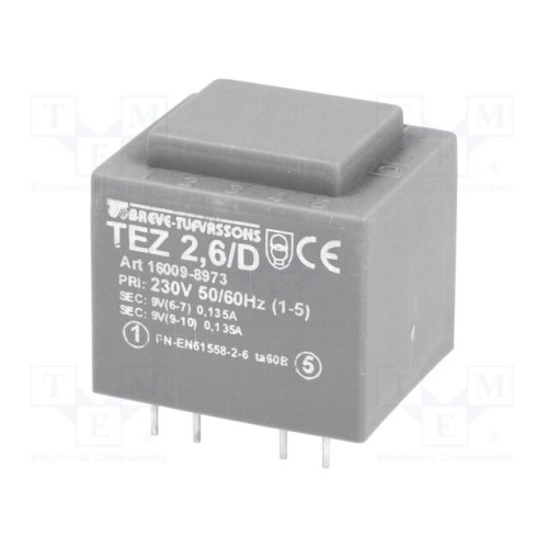 BREVE TUFVASSONS 16009-8973 | Трансформатор: литий; 2,5ВА; 230ВAC; 9В; 9В; 138,9мА; 138,9мА; PCB