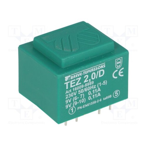 BREVE TUFVASSONS 16009-8989 | Трансформатор: литий; 2ВА; 230ВAC; 9В; 9В; 111,1мА; 111,1мА; PCB