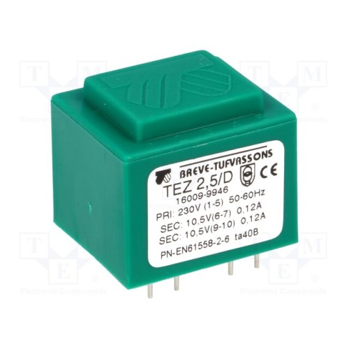 BREVE TUFVASSONS 16009-9946 | Трансформатор: литий; 2,5ВА; 230ВAC; 10,5В; 10,5В; 119мА; 119мА; PCB