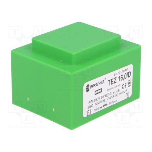 BREVE TUFVASSONS 16012-8981 | Трансформатор: литий; 16ВА; 230ВAC; 12В; 12В; 666,6мА; 666,6мА; PCB