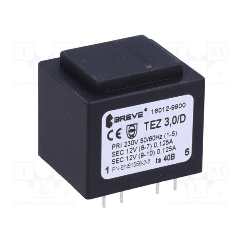 BREVE TUFVASSONS 16012-9900 | Трансформатор: литий; 3ВА; 230ВAC; 12В; 12В; 125мА; 125мА; PCB; IP00