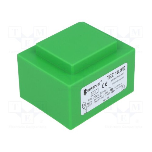 BREVE TUFVASSONS 16024-9907 | Трансформатор: литий; 16ВА; 230ВAC; 24В; 24В; 333,3мА; 333,3мА; PCB