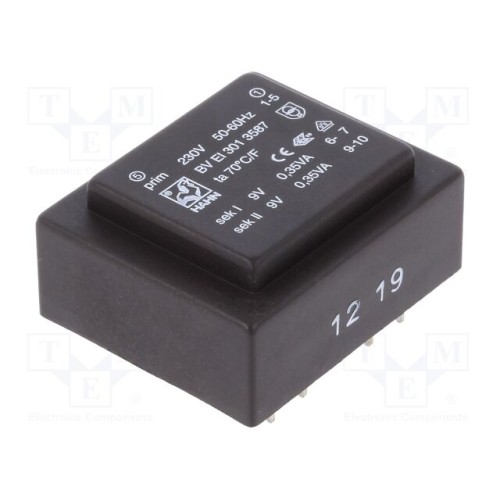 HAHN BV EI 301 3587 | Трансформатор: литий; 0,7ВА; 230ВAC; 9В; 9В; 39мА; 39мА; PCB; BVEI