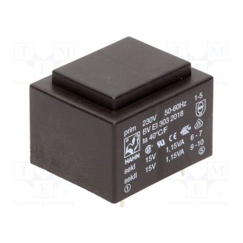 HAHN BV EI 303 2018 | Трансформатор: литий; 2,3ВА; 230ВAC; 15В; 15В; 76мА; 76мА; PCB; BVEI