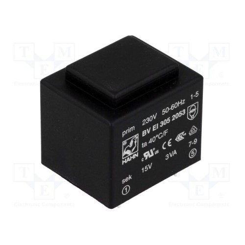 HAHN BV EI 305 2053 | Трансформатор: литий; 3ВА; 230ВAC; 15В; 200мА; PCB; BVEI