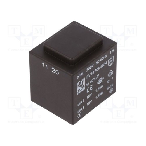 HAHN BV EI 306 3604 | Трансформатор: литий; 3,6ВА; 230ВAC; 15В; 15В; 120мА; 120мА; PCB