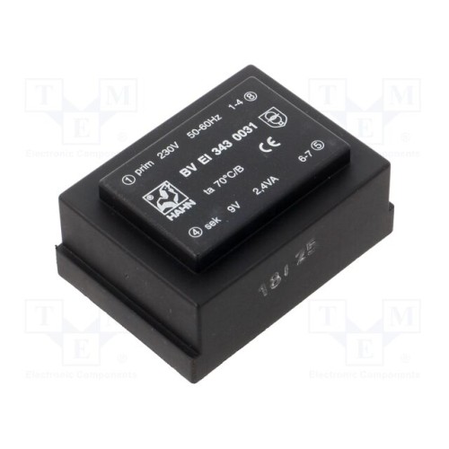 HAHN BV EI 343 0031 | Трансформатор: литий; 2,4ВА; 230ВAC; 9В; 267мА; PCB; BVEI