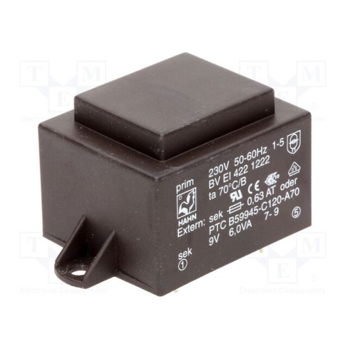 HAHN BV EI 422 1222 | Трансформатор: литий; 6ВА; 230ВAC; 9В; 667мА; PCB; BVEI