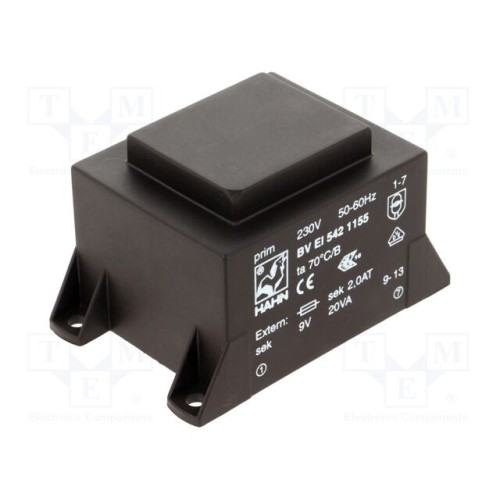 HAHN BV EI 542 1155 | Трансформатор: литий; 20ВА; 230ВAC; 9В; 2223мА; PCB; BVEI