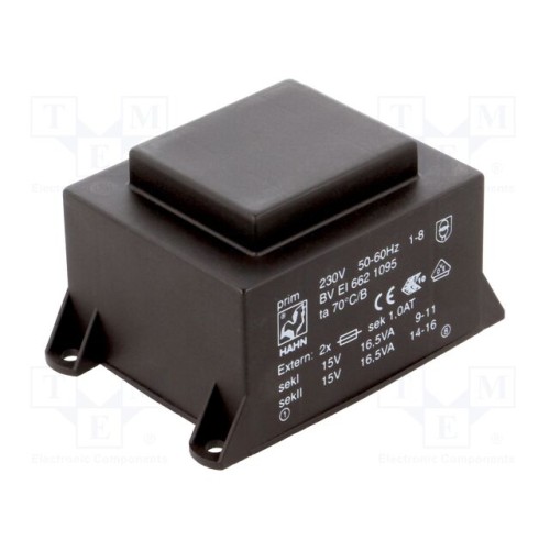 HAHN BV EI 662 1095 | Трансформатор: литий; 33ВА; 230ВAC; 15В; 15В; 1,1А; 1,1А; PCB; BVEI