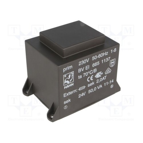 HAHN BV EI 665 1137 | Трансформатор: литий; 50ВА; 230ВAC; 24В; 2083мА; PCB; BVEI