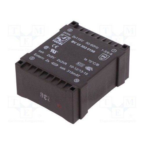 HAHN BV UI 303 0158 | Трансформатор: литий; 6ВА; 115ВACx2; 9В; 9В; 334мА; 334мА; PCB; BVUI