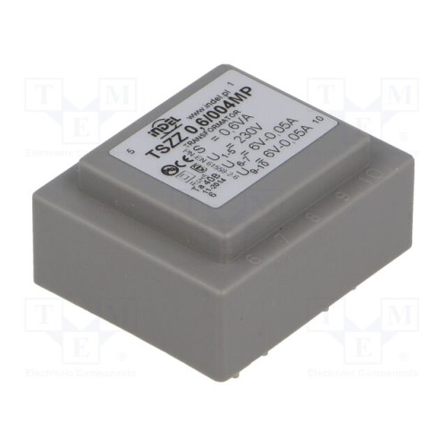 INDEL TSZZ0.6/004MP | Трансформатор: литий; 0,6ВА; 230ВAC; 6В; 6В; 50мА; 50мА; PCB; IP00