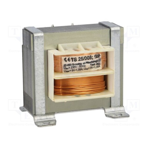 INDEL TS 25/008 | Трансформатор: мережевий; 25ВА; 230ВAC; 9В; 9В; 1,35А; 1,35А; IP00